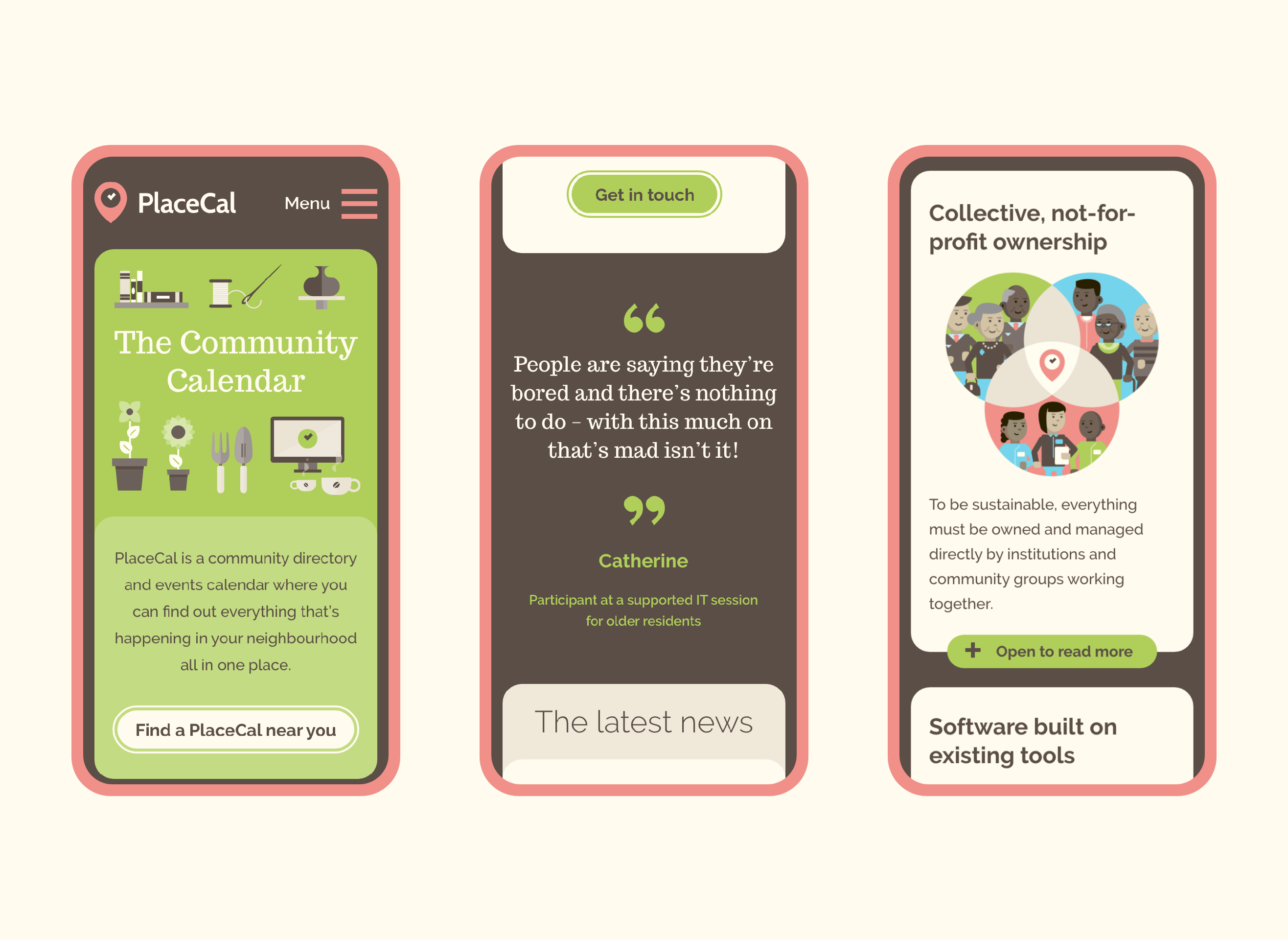 Working closely with Geeks for Social Change and Phase, we established a warm vibrant look which was both highly legible and engaging along with an identity and strapline which helped communicate quickly exactly what PlaceCal was all about.